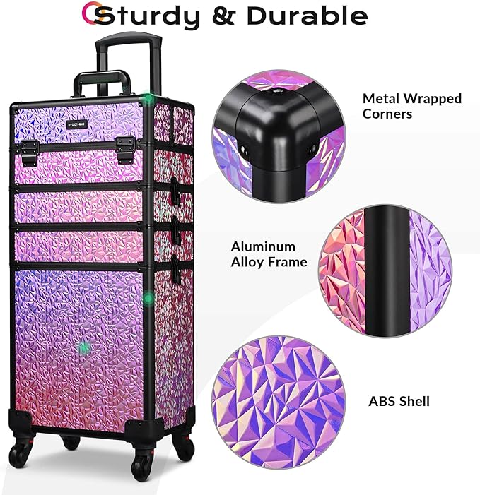 - [Iridescent Pink Design]: Byootique 4-in-1 Professional Rolling Makeup Train Case Organizer Box features a gradient pink design like mermaid scale, along with textured surface that changes the color when you view at different angles under light; Includes a detachable top case for using as an independent hand-carried case and tattoo travel case
