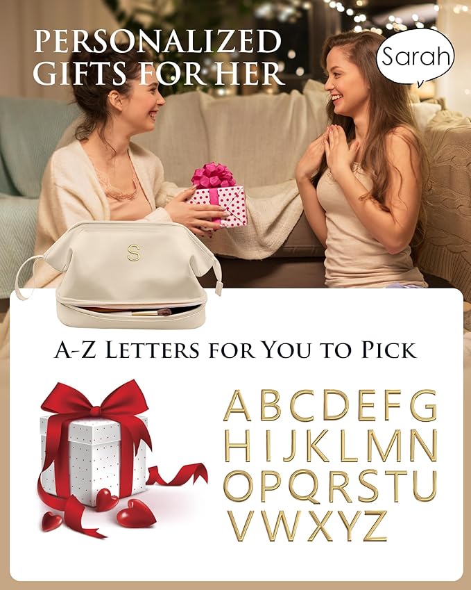 Initial Makeup Bag, Women Gifts, Personalized Double Layer Cosmetic Bag with Makeup Brush Organizer, Waterproof, Large Capacity PU Leather Travel Toiletry Bag Gifts for Friends Female Mom