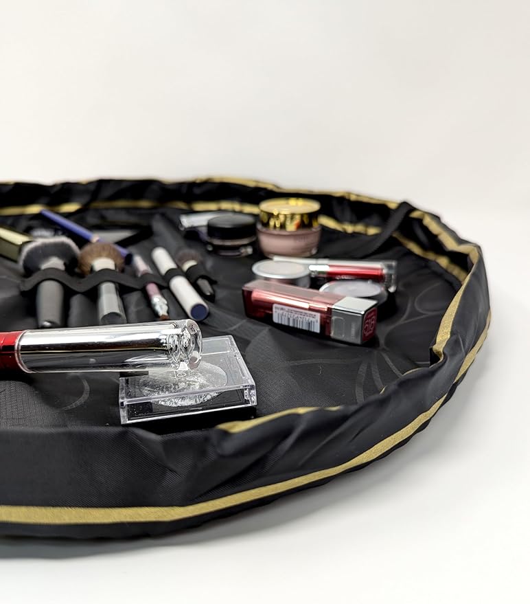 - FAST CLEANUP, NO MESS: Lay flat to instantly access all your makeup, then cinch closed for effortless cleanup – no more digging through cluttered bags or bathroom counters.