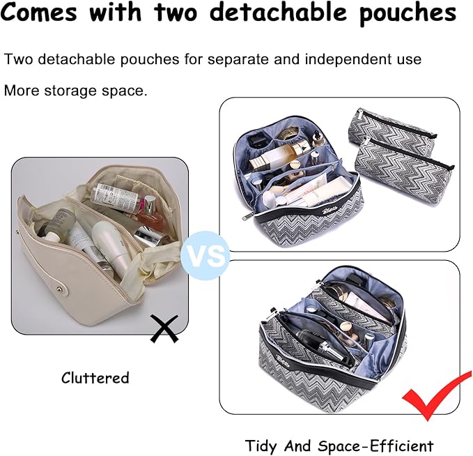 - 3 Pcs Makeup Bags Set: This travel cosmetic bags set comes with two detachable zipper small bags. Five precision-crafted compartments keep skincare and cosmetics flawlessly sorted, designed for seamless transitions between travel, business trips, outdoor adventures, and leisure escapes.