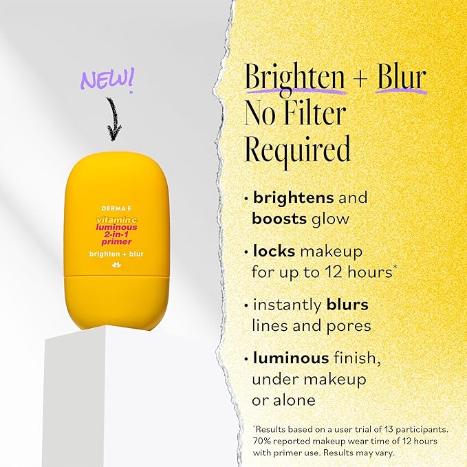 DERMA E Face Primer, Vitamin C Luminous 2-in-1 Brighten & Blur Primer, 1 Fl Oz, Stabilized Vitamin C, Hyaluronic Acid & Aloe Vera, Blurs Appearance of Pores, Wear Under Makeup for All Day Hold
